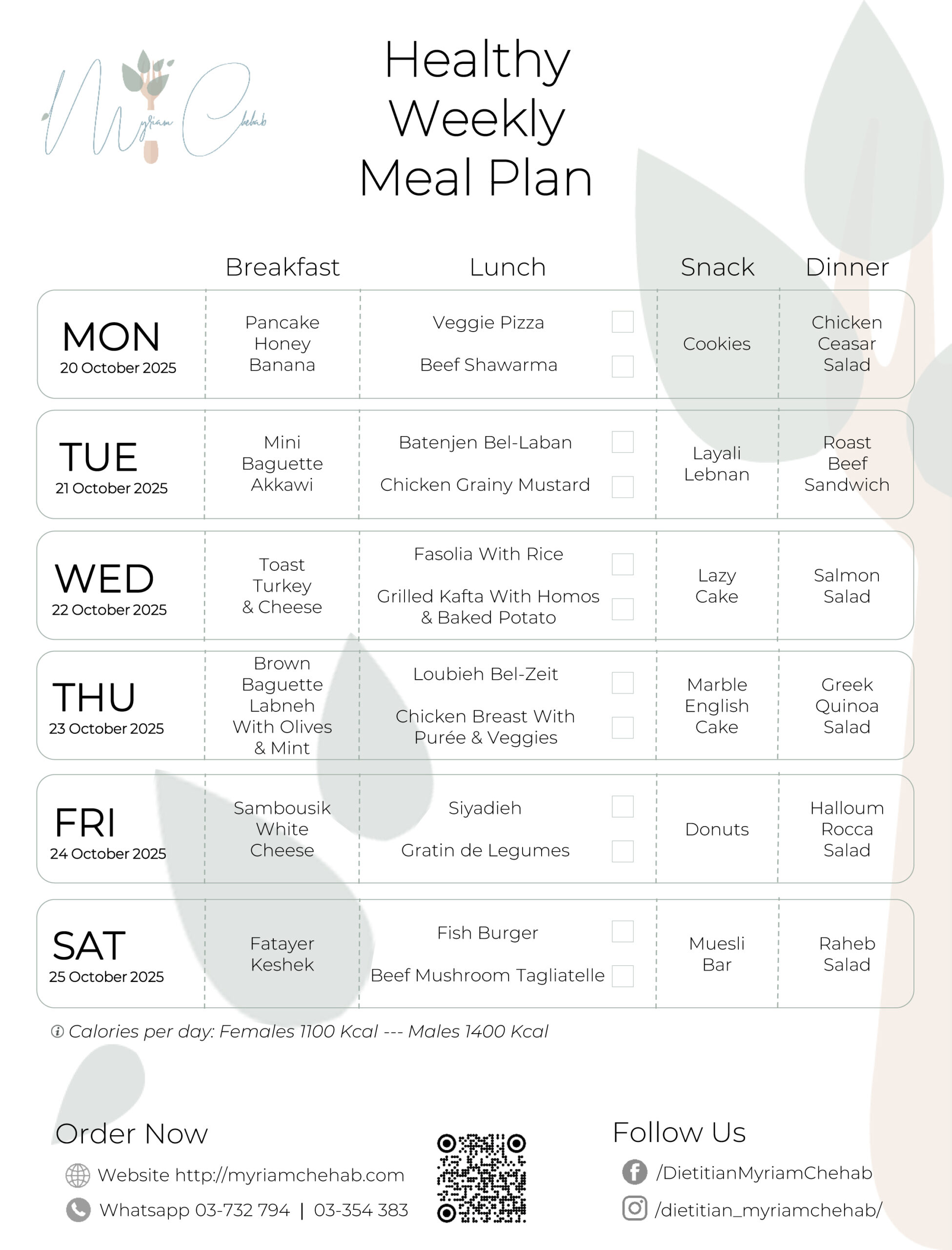 Food you enjoy, Health you deserve Weekly Meal Plans HEALTHY BOX Place an order Monday Select PackageFull Day - 18$Full Day (Male Package) - 20$Full Day Protein - 22$Full Day Protein (Male Package) - 24$Breakfast & Lunch - 14$Breakfast & Lunch (Male Package) - 16$Breakfast & Lunch Protein - 18$Breakfast & Lunch Protein (Male Package) - 20$Lunch - 10$Lunch Protein - 14$Lunch & Dinner - 16$Lunch & Dinner Protein - 20$Dinner - 10$ Select LunchVeggie PizzaBeef ShawarmaPasta Sauce RougePasta Pink SaucePasta Sauce BlancheKafta With Grileld Veggies (Protein) Quantity12345678910 Tuesday Select PackageFull Day - 18$Full Day (Male Package) - 20$Full Day Protein - 22$Full Day Protein (Male Package) - 24$Breakfast & Lunch - 14$Breakfast & Lunch (Male Package) - 16$Breakfast & Lunch Protein - 18$Breakfast & Lunch Protein (Male Package) - 20$Lunch - 10$Lunch Protein - 14$Lunch & Dinner - 16$Lunch & Dinner Protein - 20$Dinner - 10$ Select LunchBatenjen Bel-LabanChicken Grainy MustardPasta Sauce RougePasta Pink SaucePasta Sauce BlancheKafta With Grileld Veggies (Protein) Quantity12345678910 Wednesday Select PackageFull Day - 18$Full Day (Male Package) - 20$Full Day Protein - 22$Full Day Protein (Male Package) - 24$Breakfast & Lunch - 14$Breakfast & Lunch (Male Package) - 16$Breakfast & Lunch Protein - 18$Breakfast & Lunch Protein (Male Package) - 20$Lunch - 10$Lunch Protein - 14$Lunch & Dinner - 16$Lunch & Dinner Protein - 20$Dinner - 10$ Select LunchFasolia With RiceGrilled Kafta With Hommos & Baked PotatoPasta Sauce RougePasta Pink SaucePasta Sauce BlancheKafta With Grileld Veggies (Protein) Quantity12345678910 Thursday Select PackageFull Day - 18$Full Day (Male Package) - 20$Full Day Protein - 22$Full Day Protein (Male Package) - 24$Breakfast & Lunch - 14$Breakfast & Lunch (Male Package) - 16$Breakfast & Lunch Protein - 18$Breakfast & Lunch Protein (Male Package) - 20$Lunch - 10$Lunch Protein - 14$Lunch & Dinner - 16$Lunch & Dinner Protein - 20$Dinner - 10$ Select LunchLoubieh Bel-ZeitChicken Breast With Purée & VeggiesPasta Sauce RougePasta Pink SaucePasta Sauce BlancheKafta With Grileld Veggies (Protein) Quantity12345678910 Friday Select PackageFull Day - 18$Full Day (Male Package) - 20$Full Day Protein - 22$Full Day Protein (Male Package) - 24$Breakfast & Lunch - 14$Breakfast & Lunch (Male Package) - 16$Breakfast & Lunch Protein - 18$Breakfast & Lunch Protein (Male Package) - 20$Lunch - 10$Lunch Protein - 14$Lunch & Dinner - 16$Lunch & Dinner Protein - 20$Dinner - 10$ Select LunchSiyadiehGratin de LegumesPasta Sauce RougePasta Pink SaucePasta Sauce BlancheKafta With Grileld Veggies (Protein) Quantity12345678910 Saturday Select PackageFull Day - 18$Full Day (Male Package) - 20$Full Day Protein - 22$Full Day Protein (Male Package) - 24$Breakfast & Lunch - 14$Breakfast & Lunch (Male Package) - 16$Breakfast & Lunch Protein - 18$Breakfast & Lunch Protein (Male Package) - 20$Lunch - 10$Lunch Protein - 14$Lunch & Dinner - 16$Lunch & Dinner Protein - 20$Dinner - 10$ Select LunchFish BurgerBeef Mushroom TagliatellePasta Sauce RougePasta Pink SaucePasta Sauce BlancheKafta With Grileld Veggies (Protein) Quantity12345678910 Total Amount $ Please note that deliveries are made on Mondays, Wednesdays, and Fridays. Food you enjoy, Health you deserve It is time to balance your life Book an appointment Book an appointment Order a healthy meal Order a healthy meal Order the magic soup Order the magic soup