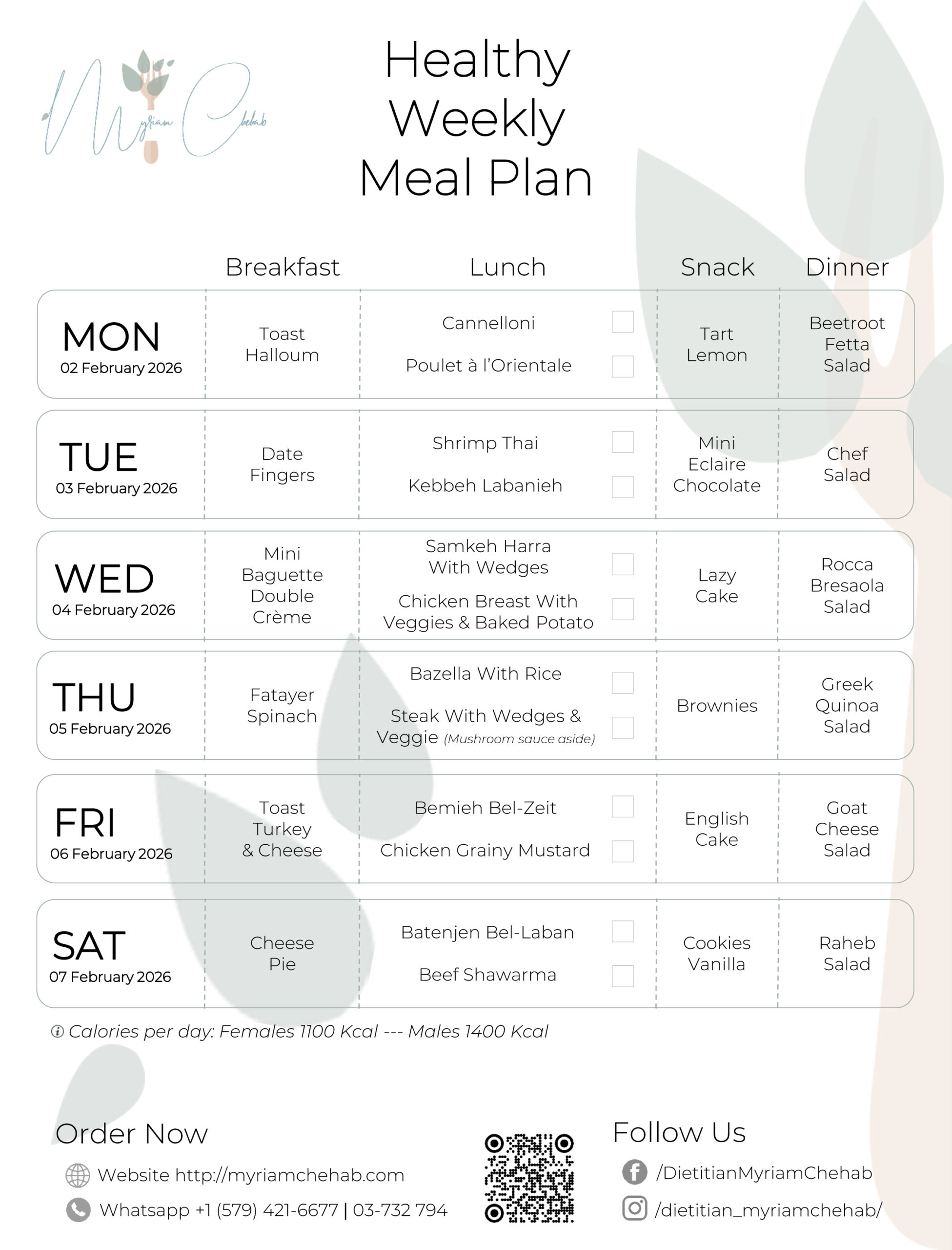 Food you enjoy, Health you deserve Weekly Meal Plans HEALTHY BOX Place an order Monday 2026-02-02 Select PackageFull Day - 23$Full Day (Male Package) - 25.5$Full Day Protein - 28.5$Full Day Protein (Male Package) - 31$Breakfast & Lunch - 16$Breakfast & Lunch (Male Package) - 18.5$Breakfast & Lunch Protein - 21.5$Breakfast & Lunch Protein (Male Package) - 24$Lunch - 12.5$Lunch Protein - 18$Lunch & Dinner - 18.5$Lunch & Dinner Protein - 24$Dinner - 12.5$ Select LunchCannelloniPoulet à l'OrientalePasta Sauce RougePasta Pink SaucePasta Sauce BlancheKafta With Grileld Veggies (Protein) Quantity12345678910 Tuesday 2026-02-03 Select PackageFull Day - 23$Full Day (Male Package) - 25.5$Full Day Protein - 28.5$Full Day Protein (Male Package) - 31$Breakfast & Lunch - 16$Breakfast & Lunch (Male Package) - 18.5$Breakfast & Lunch Protein - 21.5$Breakfast & Lunch Protein (Male Package) - 24$Lunch - 12.5$Lunch Protein - 18$Lunch & Dinner - 18.5$Lunch & Dinner Protein - 24$Dinner - 12.5$ Select LunchShrimp ThaiKebbeh LabaniehPasta Sauce RougePasta Pink SaucePasta Sauce BlancheKafta With Grileld Veggies (Protein) Quantity12345678910 Wednesday 2026-02-04 Select PackageFull Day - 23$Full Day (Male Package) - 25.5$Full Day Protein - 28.5$Full Day Protein (Male Package) - 31$Breakfast & Lunch - 16$Breakfast & Lunch (Male Package) - 18.5$Breakfast & Lunch Protein - 21.5$Breakfast & Lunch Protein (Male Package) - 24$Lunch - 12.5$Lunch Protein - 18$Lunch & Dinner - 18.5$Lunch & Dinner Protein - 24$Dinner - 12.5$ Select LunchSamkeh Harra With WedgesChicken Breast With Veggies & Baked PotatoPasta Sauce RougePasta Pink SaucePasta Sauce BlancheKafta With Grileld Veggies (Protein) Quantity12345678910 Thursday 2026-02-05 Select PackageFull Day - 23$Full Day (Male Package) - 25.5$Full Day Protein - 28.5$Full Day Protein (Male Package) - 31$Breakfast & Lunch - 16$Breakfast & Lunch (Male Package) - 18.5$Breakfast & Lunch Protein - 21.5$Breakfast & Lunch Protein (Male Package) - 24$Lunch - 12.5$Lunch Protein - 18$Lunch & Dinner - 18.5$Lunch & Dinner Protein - 24$Dinner - 12.5$ Select LunchBazella With RiceSteak With Wedges & Veggies (Mushroom Sauce aside)Pasta Sauce RougePasta Pink SaucePasta Sauce BlancheKafta With Grileld Veggies (Protein) Quantity12345678910 Friday 2026-02-06 Select PackageFull Day - 23$Full Day (Male Package) - 25.5$Full Day Protein - 28.5$Full Day Protein (Male Package) - 31$Breakfast & Lunch - 16$Breakfast & Lunch (Male Package) - 18.5$Breakfast & Lunch Protein - 21.5$Breakfast & Lunch Protein (Male Package) - 24$Lunch - 12.5$Lunch Protein - 18$Lunch & Dinner - 18.5$Lunch & Dinner Protein - 24$Dinner - 12.5$ Select LunchBemieh Bel-ZeitChicken Grainy MustardPasta Sauce RougePasta Pink SaucePasta Sauce BlancheKafta With Grileld Veggies (Protein) Quantity12345678910 Saturday 2026-02-07 Select PackageFull Day - 23$Full Day (Male Package) - 25.5$Full Day Protein - 28.5$Full Day Protein (Male Package) - 31$Breakfast & Lunch - 16$Breakfast & Lunch (Male Package) - 18.5$Breakfast & Lunch Protein - 21.5$Breakfast & Lunch Protein (Male Package) - 24$Lunch - 12.5$Lunch Protein - 18$Lunch & Dinner - 18.5$Lunch & Dinner Protein - 24$Dinner - 12.5$ Select LunchBatenjen Bel-LabanBeef ShawarmaPasta Sauce RougePasta Pink SaucePasta Sauce BlancheKafta With Grileld Veggies (Protein) Quantity12345678910 Total Amount $ Please note that deliveries are made on Mondays, Wednesdays, and Fridays. Food you enjoy, Health you deserve It is time to balance your life Book an appointment Book an appointment Order a healthy meal Order a healthy meal Order the magic soup Order the magic soup