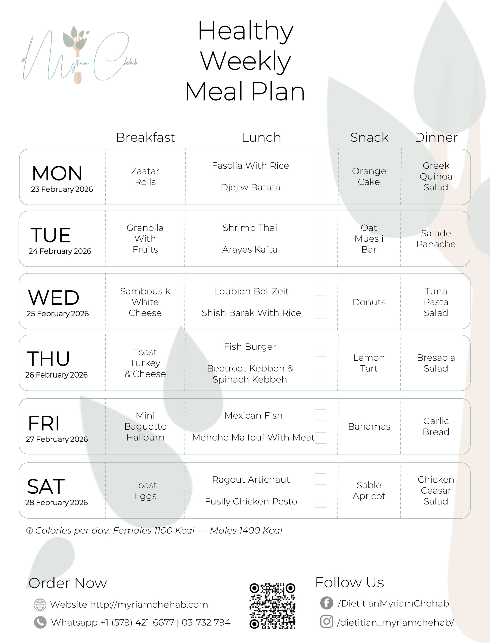 Food you enjoy, Health you deserve Weekly Meal Plans HEALTHY BOX Place an order Monday 2026-02-23 Select PackageFull Day - 23$Full Day (Male Package) - 25.5$Full Day Protein - 28.5$Full Day Protein (Male Package) - 31$Breakfast & Lunch - 16$Breakfast & Lunch (Male Package) - 18.5$Breakfast & Lunch Protein - 21.5$Breakfast & Lunch Protein (Male Package) - 24$Lunch - 12.5$Lunch Protein - 18$Lunch & Dinner - 18.5$Lunch & Dinner Protein - 24$Dinner - 12.5$ Select LunchFasolia With RiceDjej w BatataPasta Sauce RougePasta Pink SaucePasta Sauce BlancheKafta With Grileld Veggies (Protein) Quantity12345678910 Tuesday 2026-02-24 Select PackageFull Day - 23$Full Day (Male Package) - 25.5$Full Day Protein - 28.5$Full Day Protein (Male Package) - 31$Breakfast & Lunch - 16$Breakfast & Lunch (Male Package) - 18.5$Breakfast & Lunch Protein - 21.5$Breakfast & Lunch Protein (Male Package) - 24$Lunch - 12.5$Lunch Protein - 18$Lunch & Dinner - 18.5$Lunch & Dinner Protein - 24$Dinner - 12.5$ Select LunchShrimp ThaiArayes KaftaPasta Sauce RougePasta Pink SaucePasta Sauce BlancheKafta With Grileld Veggies (Protein) Quantity12345678910 Wednesday 2026-02-25 Select PackageFull Day - 23$Full Day (Male Package) - 25.5$Full Day Protein - 28.5$Full Day Protein (Male Package) - 31$Breakfast & Lunch - 16$Breakfast & Lunch (Male Package) - 18.5$Breakfast & Lunch Protein - 21.5$Breakfast & Lunch Protein (Male Package) - 24$Lunch - 12.5$Lunch Protein - 18$Lunch & Dinner - 18.5$Lunch & Dinner Protein - 24$Dinner - 12.5$ Select LunchLoubieh Bel-ZeitShish Barak With RicePasta Sauce RougePasta Pink SaucePasta Sauce BlancheKafta With Grileld Veggies (Protein) Quantity12345678910 Thursday 2026-02-26 Select PackageFull Day - 23$Full Day (Male Package) - 25.5$Full Day Protein - 28.5$Full Day Protein (Male Package) - 31$Breakfast & Lunch - 16$Breakfast & Lunch (Male Package) - 18.5$Breakfast & Lunch Protein - 21.5$Breakfast & Lunch Protein (Male Package) - 24$Lunch - 12.5$Lunch Protein - 18$Lunch & Dinner - 18.5$Lunch & Dinner Protein - 24$Dinner - 12.5$ Select LunchFish BurgerBeetroot Kebbeh & Spinach KebbehPasta Sauce RougePasta Pink SaucePasta Sauce BlancheKafta With Grileld Veggies (Protein) Quantity12345678910 Friday 2026-02-27 Select PackageFull Day - 23$Full Day (Male Package) - 25.5$Full Day Protein - 28.5$Full Day Protein (Male Package) - 31$Breakfast & Lunch - 16$Breakfast & Lunch (Male Package) - 18.5$Breakfast & Lunch Protein - 21.5$Breakfast & Lunch Protein (Male Package) - 24$Lunch - 12.5$Lunch Protein - 18$Lunch & Dinner - 18.5$Lunch & Dinner Protein - 24$Dinner - 12.5$ Select LunchMexican FishMehche Malfouf With MeatPasta Sauce RougePasta Pink SaucePasta Sauce BlancheKafta With Grileld Veggies (Protein) Quantity12345678910 Saturday 2026-02-28 Select PackageFull Day - 23$Full Day (Male Package) - 25.5$Full Day Protein - 28.5$Full Day Protein (Male Package) - 31$Breakfast & Lunch - 16$Breakfast & Lunch (Male Package) - 18.5$Breakfast & Lunch Protein - 21.5$Breakfast & Lunch Protein (Male Package) - 24$Lunch - 12.5$Lunch Protein - 18$Lunch & Dinner - 18.5$Lunch & Dinner Protein - 24$Dinner - 12.5$ Select LunchRagout ArtichautFusily Chicken PestoPasta Sauce RougePasta Pink SaucePasta Sauce BlancheKafta With Grileld Veggies (Protein) Quantity12345678910 Total Amount $ Please note that deliveries are made on Mondays, Wednesdays, and Fridays. Food you enjoy, Health you deserve It is time to balance your life Book an appointment Book an appointment Order a healthy meal Order a healthy meal Order the magic soup Order the magic soup